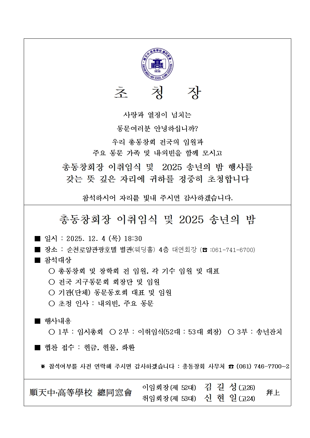 12. 4(금) 총동창회장이취임식 및 송년의 밤 행사 초청